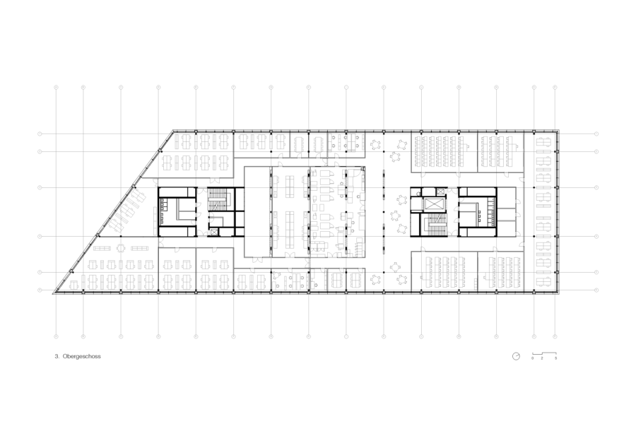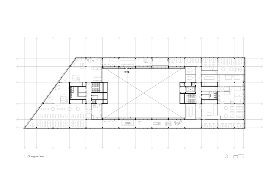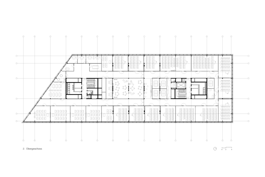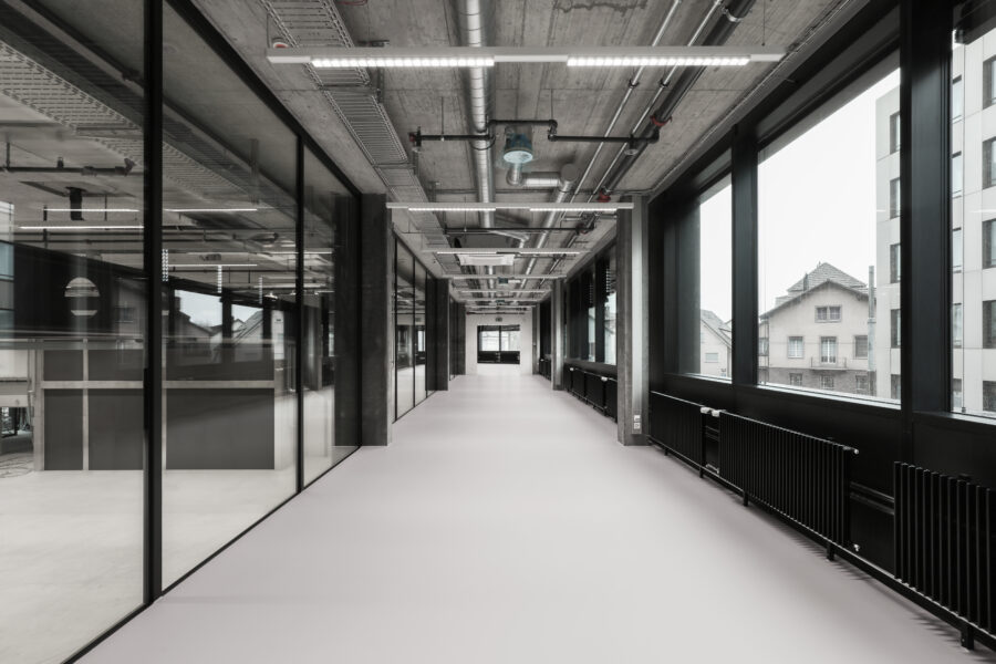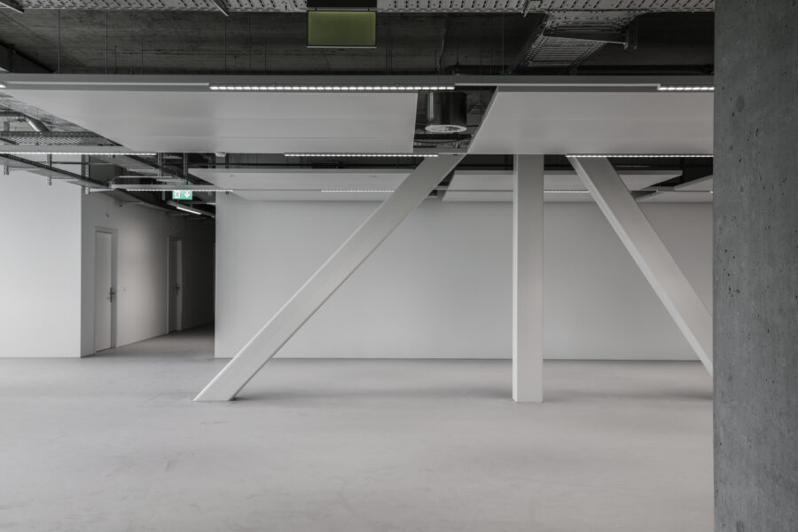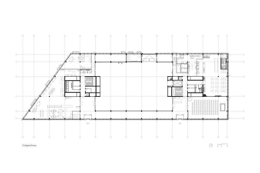 Die programmatische Mitte des Gebäudes bildet die zweigeschossige Halle im Erdgeschoss. Sie ist das Zentrum des halböffentlichen Stadtparterres des Innovationsparks. Durch seine hohe Transparenz und den gut auffindbaren Eingängen, ist es die verknüpfende Ebene zum urbanen gesellschaftlichen Lebens in Biel/Bienne.